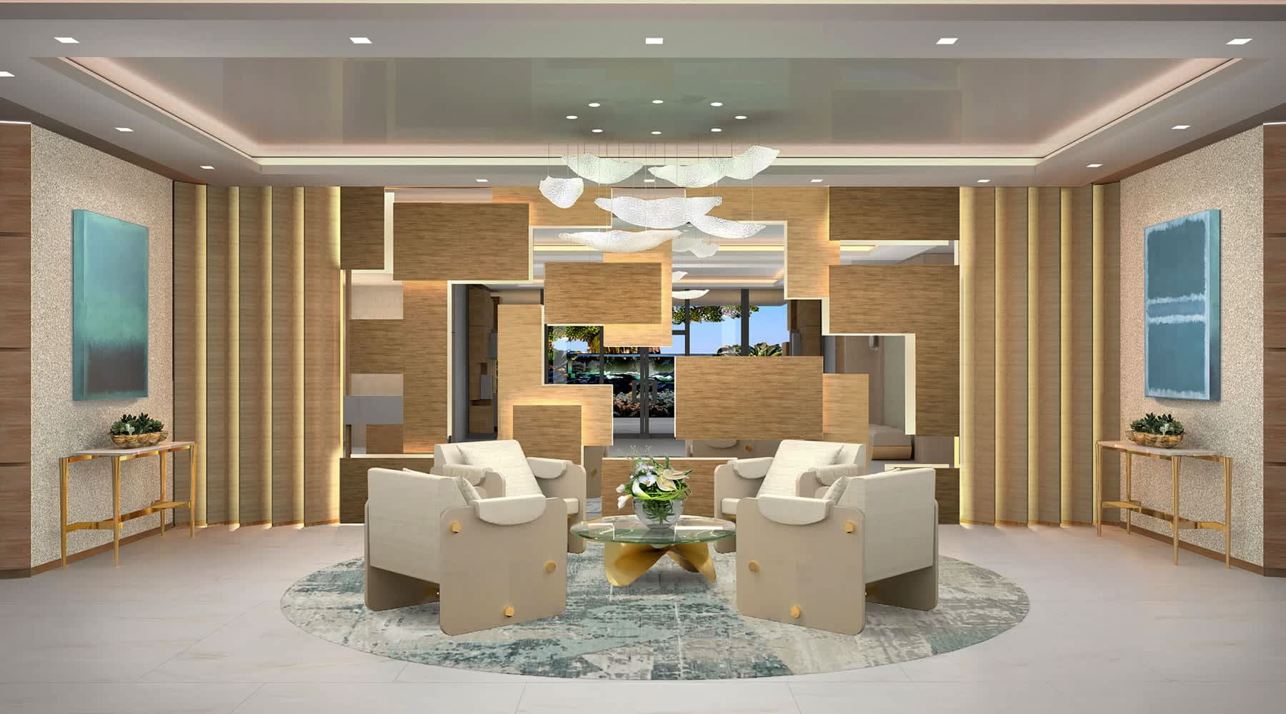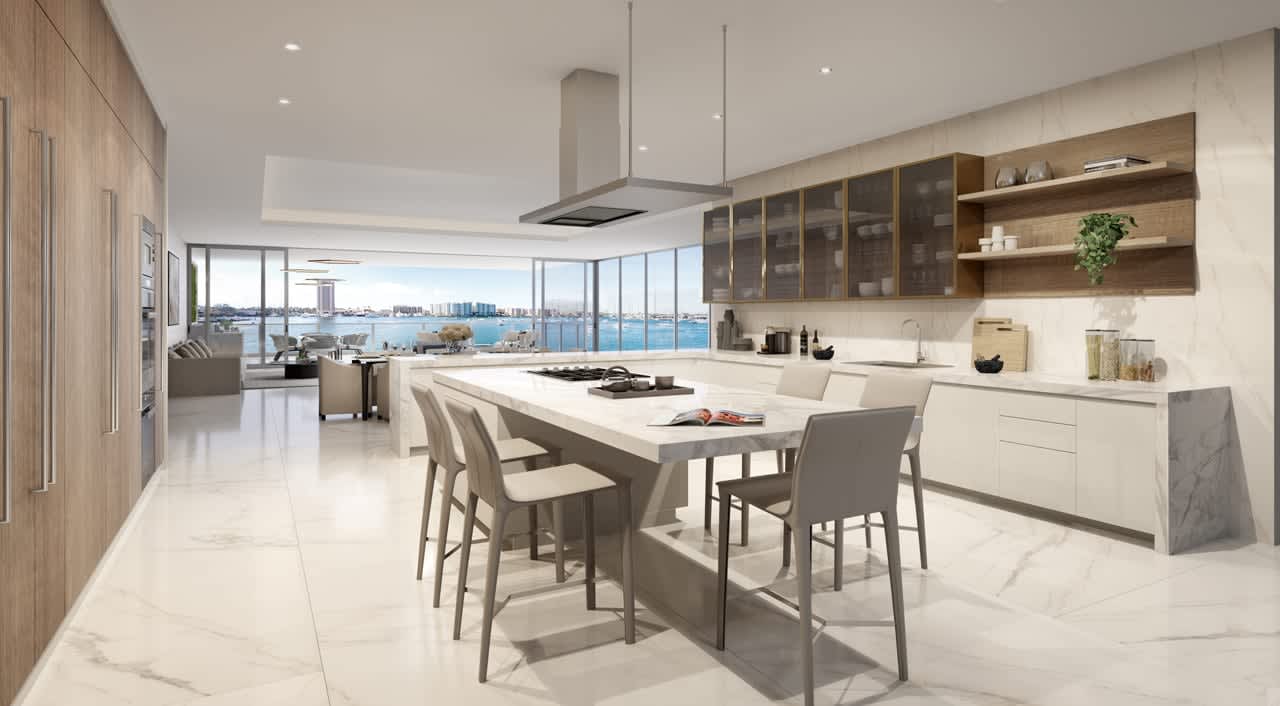 Boca Beach House features a lakefront relaxation deck with a swimming pool surrounded by lush, colorful tropical plants and flowers overlooking Lake Boca Raton, as well as a gazebo equipped with a kitchen, barbecue grill, TV, and lounge area. At the water’s edge, a private marina enables residents to take off for a day of sailing or speedboating at a moment’s notice. Outdoor amenities arrayed along Lake Boca Raton’s waterfront include an expansive pool terrace, barbecue area, yoga practice area, lakefront boardwalk, and secluded outdoor spa surrounded by the tropical landscape in an intimate setting. Boca Beach House’s outdoor amenity areas have been designed with hidden spaces near the pool and spa for relaxation, meditation, or quiet-time reading in the fresh air. Chaise lounges and lush landscaping make these little pockets an escape within an escape. An aqua room is available to residents for storage of paddleboards, kayaks, and fishing equipment. With just 32 homes, entered via private vestibule and all offering thoughtfully designed individual outdoor space, Boca Beach House provides an exceptional level of privacy, just like a traditional private home. Set directly on Lake Boca Raton and designed with up to 10-foot-high ceilings and large windows, the interiors enjoy abundant natural light and beautiful panoramic views. Upper-floor homes have two terraces, one of which faces Lake Boca Raton and is designed with a beautifully equipped summer kitchen. Ground-level homes feature a single spacious lake-facing terrace with a summer kitchen, a private pool, and landscaping that creates a natural screen between neighboring terraces while leaving views of the lake open and expansive. The interiors of Boca Beach House’s one- to four-bedroom homes feature sophisticated European craftsmanship, including kitchen cabinetry by Italian manufacturer MiaCucina and appliances by Gaggenau. Much like the simple elegance of the exterior architecture by Sieger Suárez, the interiors have a contemporary, yet timeless aesthetic. A neutral palette has been selected to complement the building’s contemporary architecture while infusing it with warmth. Elegant furnishings strike the same balance of sophistication and comfort.